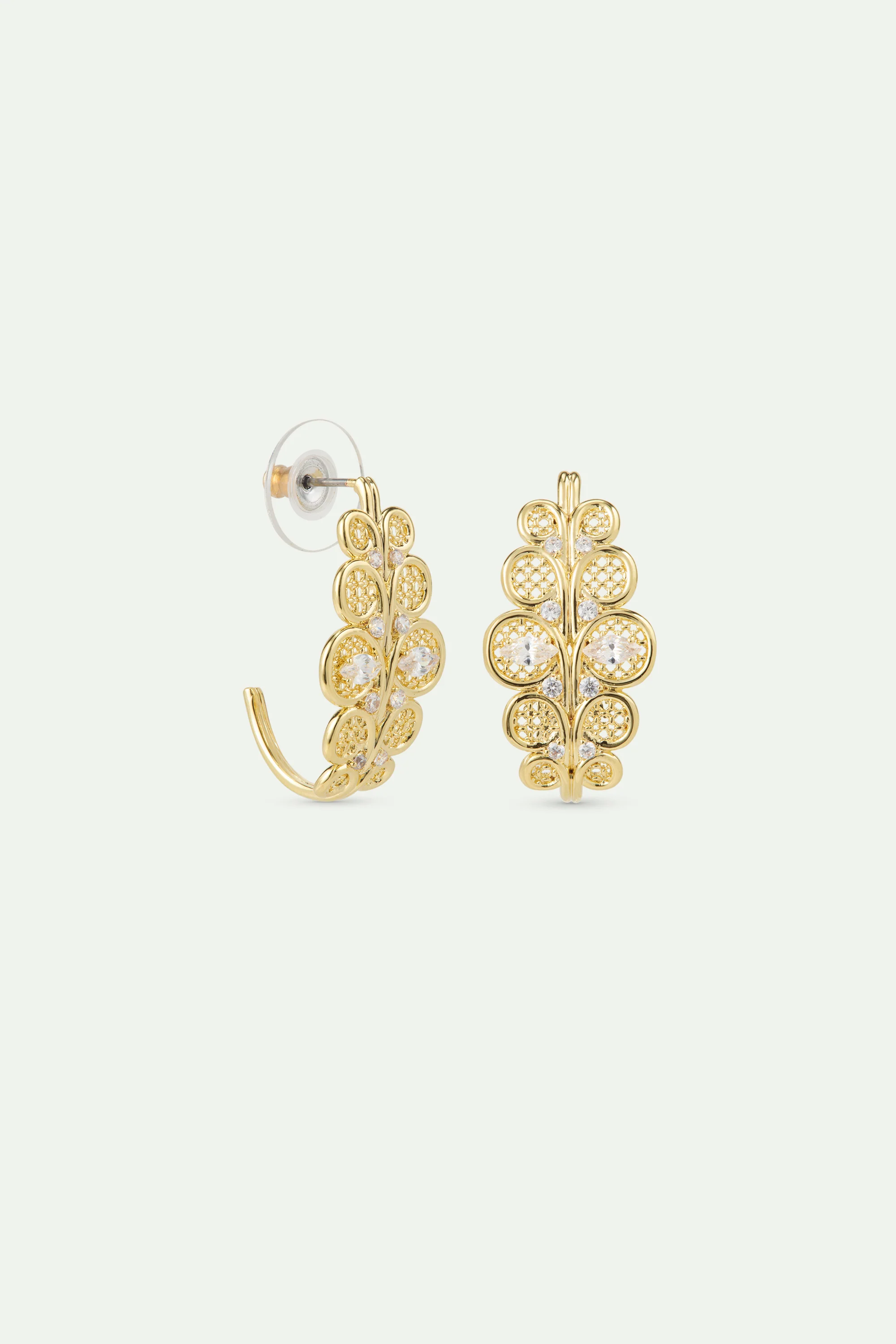 Post earrings, tiara hoop earrings in brass gilded with fine gold filigree, adorned with marquise-cut and round crystals.