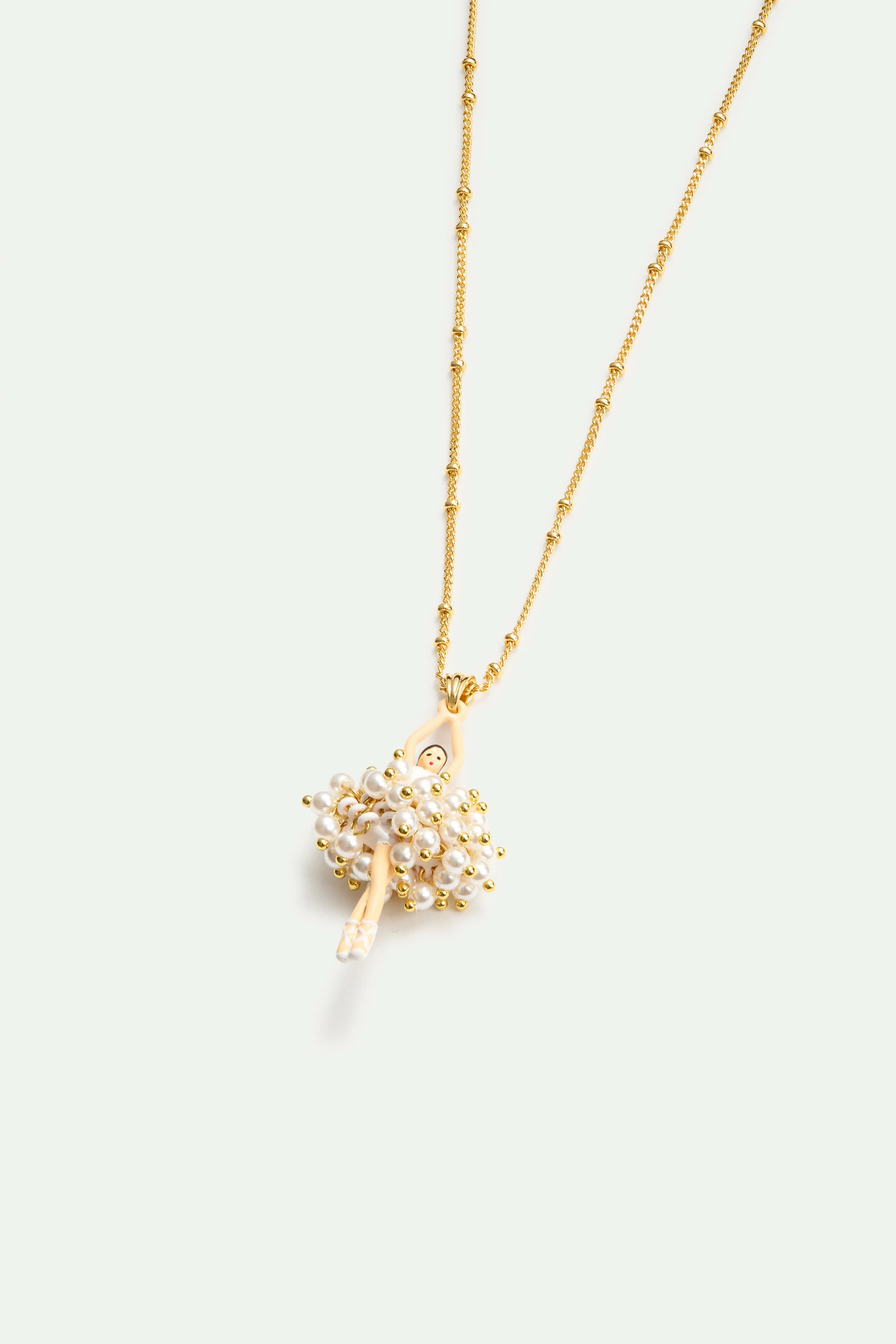 hand-painted ballerina pendant necklace, wearing a white corset and gold beaded tutu. Gold-plated brass beaded chain.